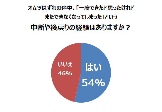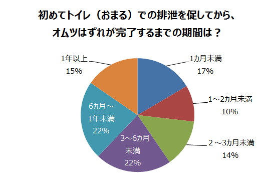 オムツはずれスタートから完了まで6ヵ月前後。半数以上のかたが後戻りを経験。