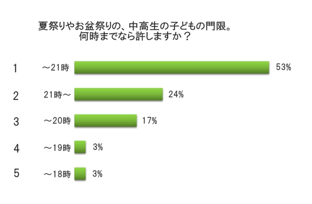 やはり夏は祭りやイベントがあり、友達同士で楽しみたいことは親もわかっているようで、終わった後もお話ししたり、余韻を楽しむ時間があるほうが良いと考えている親が多いようです。しかし、それでも22時を過ぎると心配になるようで、遅くても22時という人が多く見られました。