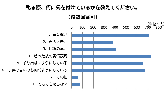 「叱る際、何に気を付けているか」についても伺ったところ、「怒ったあとの愛情表現」が最も多く、「言葉遣い」「子どもの言い分も聞くようにしている」「手がでないようにしている」も多かった回答でした。