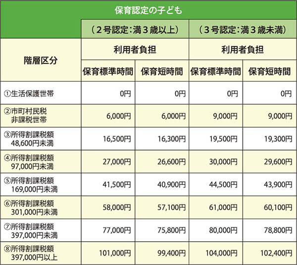 そして、保育料は下記の図のように、生活保護世帯、市町村民税非課税世帯、所得割課税額6段階の計8階層に分かれ、国が利用者負担の上限額を階層ごとに定めています。自分の所得割額がどの階層なのかによって、保育料が決定するしくみであることがわかります。