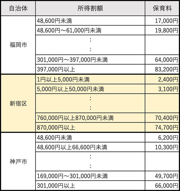 各自治体とも、住民税の所得割額の階層別に保育料を定めているという点は同じですが、その金額はもちろん、何階層に分けているのかもそれぞれ異なっています。そこで、東京都新宿区、兵庫県神戸市、福岡県福岡市の3つの自治体を、2023年度の保育料で比較してみました。