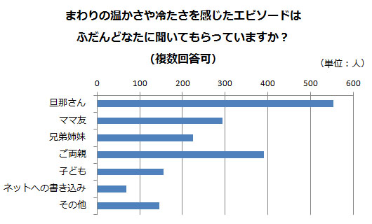 心温まるエピソードに出合う機会が多い子育て中。エピソードについて「ふだんどなたに聞いてもらっていますか?」と尋ねたところ、いちばん多かったのは、「旦那さん」でした。その次は「ご両親」。大事な人にこそエピソードの温かさを共有して、一緒に喜んでもらえれば幸せな気持ちが2倍になりますよね。また、夫婦で子どもの温かい、優しいエピソードを共有することで、子育てを二人でしているという実感も高まるのではないでしょうか。