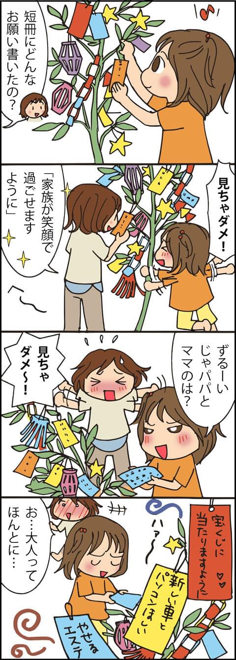 【育児あるあるマンガ】七夕のお願いはヒミツ 育児・子育て 短冊に書いた願い事、子どもには読まれたくない!? マンガ:齊藤 恵 プロフィール 齊藤恵 マンガ家イラストレーター赤ちゃんの遊びBOOK(シリーズ5冊)、NHK Eテレ すくすく子育て 愛情が伝わる!叱り方ほめ方関わりことば26などの書籍のマンガ、イラストを担当 共感した 学びがあった 分かりにくい 育児・子育て 子育て・教育Q&A 【小学生】2018年から学校での英語教育はどう変わるの? 【高校生】問題が解けなかったときに、答えを写すことに意味がありますか? 【小学生】漢字二字の熟語の構成(組み立て)を見分けることができません。見分ける方法はありますか?