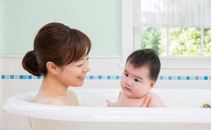 まずは保護者自身の体を洗ってから、赤ちゃんも浴室へ。おしりなどをざっと洗い、下から上へお湯をかけてから、湯船に入りましょう。3~5分ほど温まれば十分です。