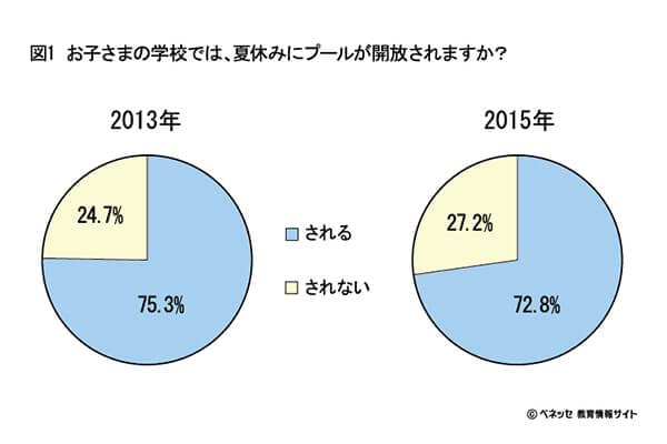 まず、夏休みに学校でプール開放が実施されるかどうかを伺ったところ、実施されると答えた保護者が7割強。3割弱は実施されませんが、その理由としては「監視員の確保ができなくなった」「保護者の当番が負担だから」など、実施に際してのサポート体制が整わないという回答が散見されます。2013(平成25)年に実施した同様のアンケート調査と比較すると、今回の15(同27)年の調査では、実施されない学校が微増となっています。