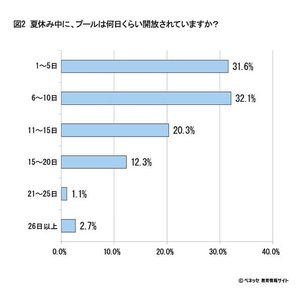 では、プール開放が実施できている学校では、何日くらい開放されているのでしょうか。伺ってみたところ、「1~5日」が約3割、「6~10日」も約3割と多く、夏休み期間の長さに対して比較的少ない実施日数になっているようです。