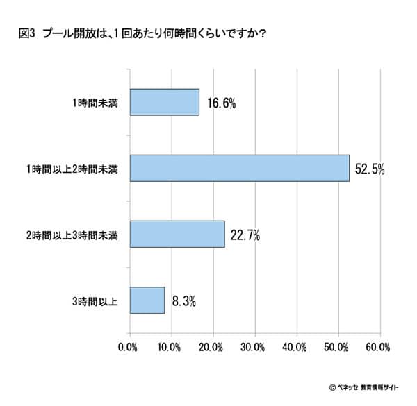 また、1日1回あたりの時間についても伺ってみたところ、「1時間以上2時間未満」に声が集中しました。これには、「子どもが物足りなさそうだから実施日数を増やしてほしい」「1回の時間が短すぎる」という声が多く寄せられました。ちょうどよい日数・時間だという声はほとんど見られず、多くの保護者は「自分が子どものころのように、ほぼ毎日プール開放をしてほしい」という気持ちが強いようです。