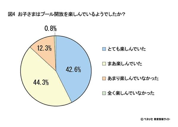 プール開放の日数・時間をもっと増やしてほしいという保護者の声が多いのは、やはり子どものことを思う気持ちが強いからなのかもしれません。子どもがプール開放を楽しんでいるかどうかを伺ったところ、「とても楽しんでいた」と「まあ楽しんでいた」という回答を合わせると、実に約9割もの子どもがプール開放を楽しんでいるということがわかりました。