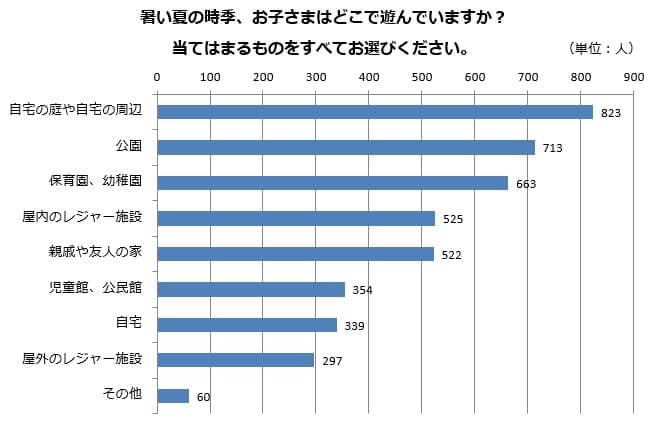 最近、とくに日中は、身の危険を感じるくらい暑い日もありますよね。暑いと熱中症も心配。そんな大人の思いとは関係なく、暑い日でも、子どもたちは意外と外で遊んでいるようです。暑い時期、子どもがどんな所で遊んでいるのかアンケートで尋ねてみたところ、最も多かったのは、「自宅の庭や自宅の周辺」でした(※1)。