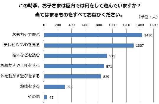 屋内を見てみると、「おもちゃで遊ぶ」「テレビやDVDを見る」が上位でした。屋外よりも屋内のほうが熱中症の危険は少ないですが、油断は禁物。屋内で熱中症にかかるケースもあるため、エアコン等での温度調整やこまめな水分補給を欠かさないことが大事です。