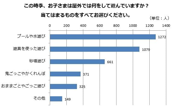 屋外での遊びについて見てみると、「プールや水遊び」が多く、夏の暑い日らしい結果に。水に触れる遊びだと、暑さを和らげることもできそうですね。その他の回答では、「虫とり」「野球」「自転車」などが挙がっていました。