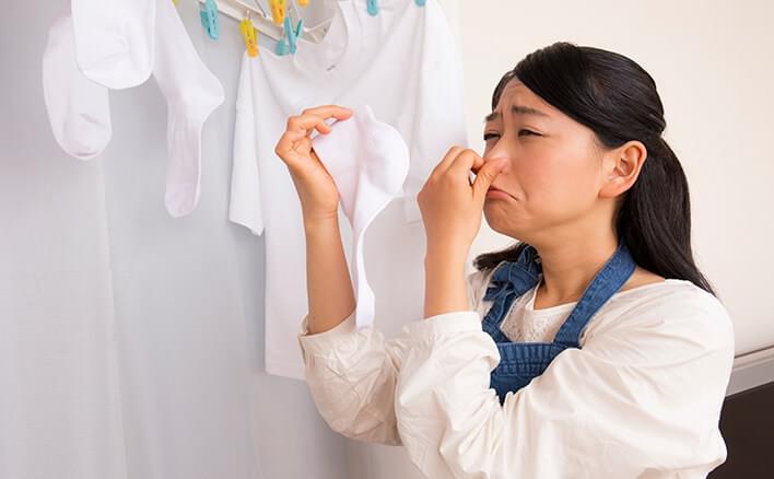 そもそも汗にニオイはありません。衣服についた汗のニオイの原因は雑菌によるものです。衣服についた汗に皮脂やアカが混ざり合って雑菌が発生し、それがニオイのもとになっているのです。雑菌は高温多湿を好むので夏場は特に注意が必要です。本来ならば、雑菌が繁殖しないうちに素早く洗濯してしまうのがよいのですが、実際はなかなかそうもいきませんよね。