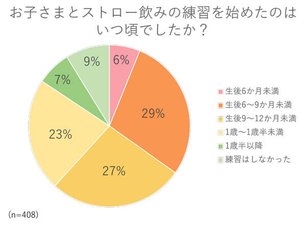 保護者のかた408人に聞いたアンケート結果によると、ストロー飲みの練習を始めた時期として最も多かったのは「生後6~9か月未満」でした。8割近くのかたが生後6か月から1歳半までの間に練習を行っているようです。
