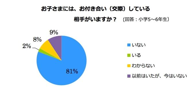 小学生では「いない」という回答が圧倒的に多く、80~90%。「いる」という回答は2~3%と少なめですが、小学校高学年になると、「以前はいたが、今はいない」という割合が9%になり、小学校高学年では、交際相手がいる・いたことのある子を合わせると10%を超えることがわかりました。