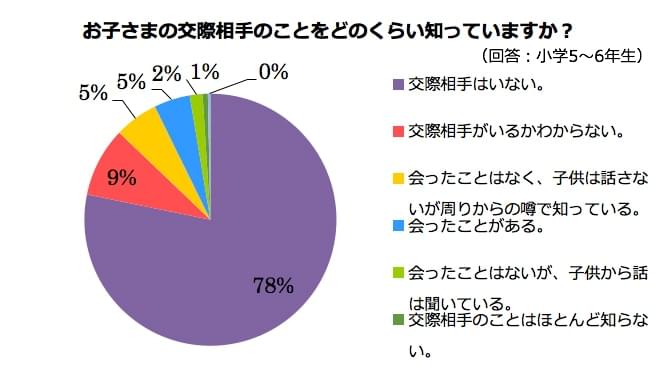 交際相手が10%超の割合でいる小学校高学年では、そのうち5%が「相手に会ったことがある」という回答だった一方、「会ったことはなく、子どもは話さないが周りからの噂で知っている」という回答も同数。2%の「会ったことはないが、子どもから話を聞いている」より多いのが意外な印象を受けます。
