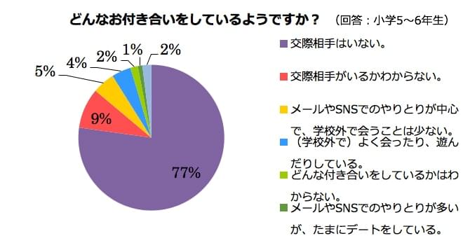 小学生は、「学校外で遊んだりする」という子が2~4%いる程度で、「デートをしている」という子はほとんどいませんでした。また、学年が上がるにつれて「メールやSNSでのやりとり」をしている子が5%ほどまで増加しました。