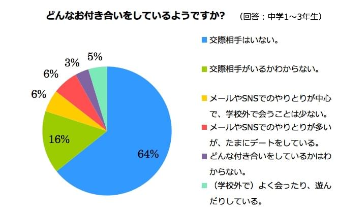 次に、中学生です。「メールやSNSのやりとりが中心で、学校外で会うことはない」「メールやSNSでのやりとりが多いが、たまにデートをしている」子の割合がそれぞれ6%。二つ合わせると「学校外でよく会ったり遊んだりしている」の2倍以上の数字となり、中学生の交際ではメールやSNSが大きな存在となっているようです。