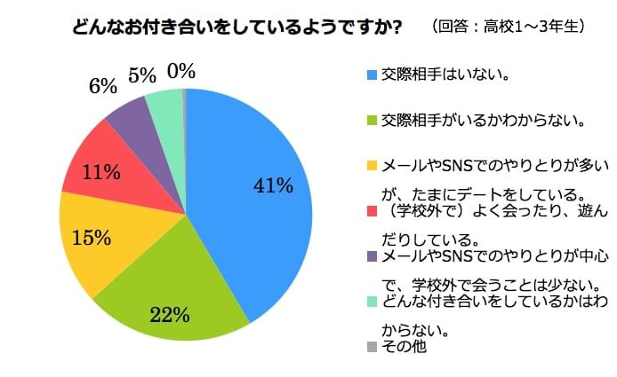 高校生になると、「メールやSNSでのやりとりが多いが、たまにデートをしている」という回答が15%、「学校外でよく会ったり、遊んだりしている」が11%になりました。「メールやSNSでのやりとりが中心で、学校外で会うことは少ない」という回答は6%で、高校生ならではの行動範囲の広がりを感じさせる結果となりました。