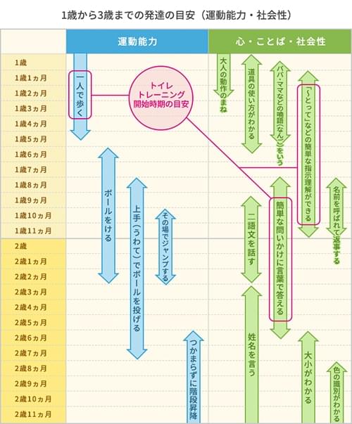 上の表は2歳のお子さんの発達の目安です。「言葉が増えて自分の意思をしっかり伝えられる」といった心の発達と、「手先が器用になって、色々な動作ができる」といった体の発達が目覚ましい時期であることがわかります。2歳は、トイレトレーニングを始めるのに適した時期だと言えるでしょう。