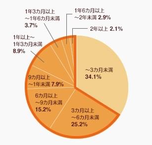 アンケートでは、約7割の人が3ヵ月以上かかっている、と答えています。また、約3割は3ヵ月未満ですが、半年以上、1年以上かかっているお子さんもいます。トイレトレーニングの進み具合は個人差が大きいので、まわりと比較せず、お子さんのペースを優先して進めていくことが大切です。