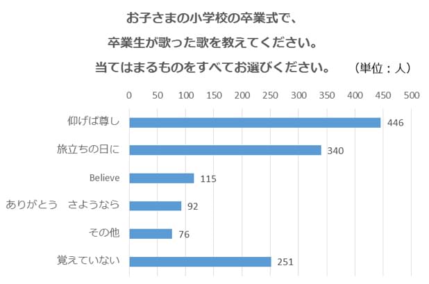 現在、中・高生のお子さまを持つ保護者を対象に、「お子さまの小学校の卒業式で、卒業生が歌った歌を教えてください」と質問したところ、最も多い回答が『仰げば尊し』で、446人のかたが挙げました。卒業生が教師に感謝し学校生活を振り返るというこの歌は、明治時代に発表された唱歌で、以後、学校の卒業式で広く歌われ親しまれてきました。名曲はやはり歌い継がれるものなのですね。