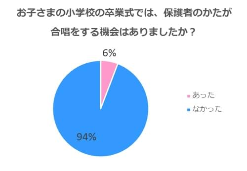 ところで、卒業式の式典のなかでは、保護者が合唱することもあるのでしょうか。「お子さまの小学校の卒業式では、保護者のかたが合唱をする機会はありましたか?」と尋ねたところ、やはり圧倒的に、94%が「なかった」でした。主役は子どもたちですから、当然といえば当然の結果でしょうか。