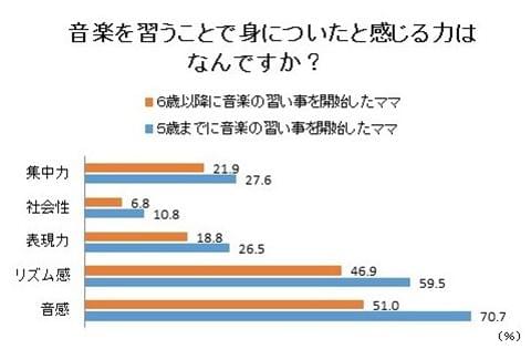 幼少期に音楽を習っていたママたちへのアンケートによると、音感やリズム感、表現力や集中力など、さまざまな力が身についたと実感しているようです。中でも5歳までに習い始めたママたちのほうが、6歳以降に始めたママたちよりも「力が身についた!」と感じる割合が2~3割程度も高いという結果になりました。