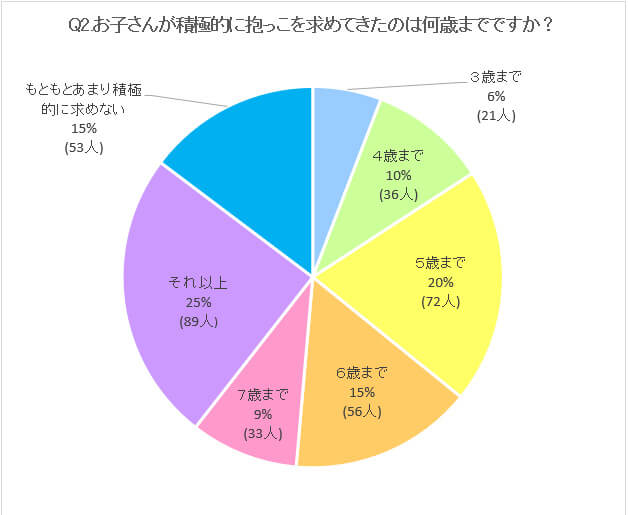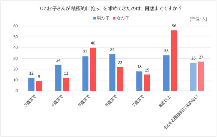 「積極的に抱っこを求めてきたのは何歳までですか?」という質問に対して、回答が多く集まったのは「5歳」「6歳」で合わせて360人中128人となり全体の約35%でした。「8歳以上」という回答では女の子のほうが多いという結果が目立ちます。一定以上の年齢になっても女の子のほうがスキンシップに抵抗が少ないと言えるかもしれません。
