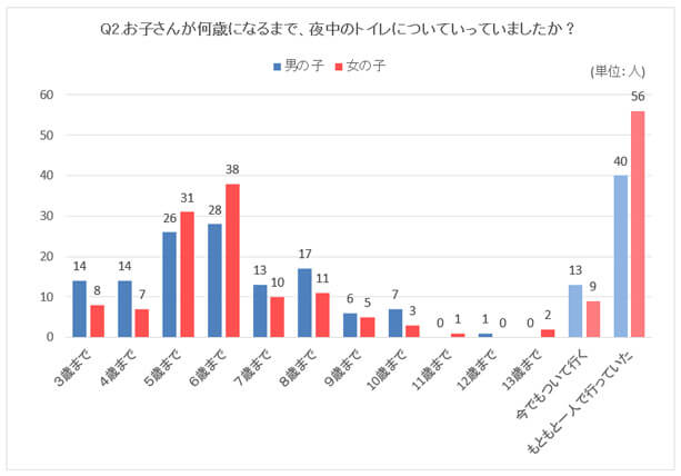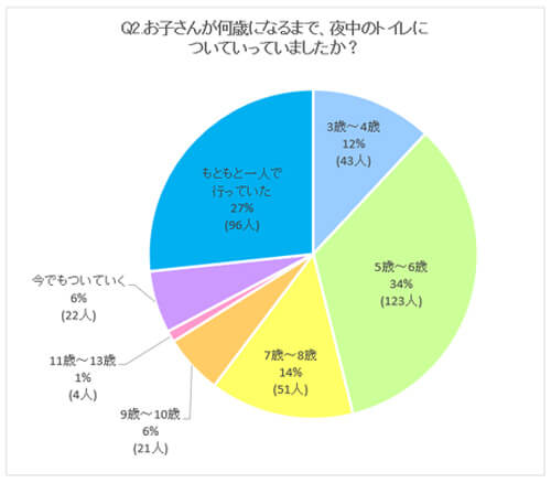 「何歳になるまで、夜中のトイレについていっていましたか?」と聞いたところ、グラフのピークは「5歳まで」「6歳まで」となり、合計360人中123人、全体の約34%になりました。お子さんが夜中でもトイレに一人で行けるようになるタイミングは、小学校に入学するころが多いことがわかります。