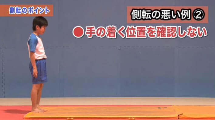 二つ目は、手の着く位置をしっかり確認せず、前回りのように回ってしまうことです。正しく回転するには手を着く位置が重要なため、目線は手の着く位置に定めるように意識しましょう。