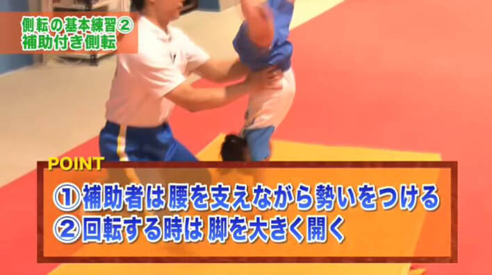 補助付き側転を家で練習する時は、布団などを使いましょう。保護者のかたはお子さんの脚がぶつからないように、布団の脇(お子さんが両手を着く位置)にひざ立ちして待機します。そして、お子さんが両手をマットに着けて脚を振り上げたところで、保護者のかたは腰を支えて体のバランスをとりましょう。
