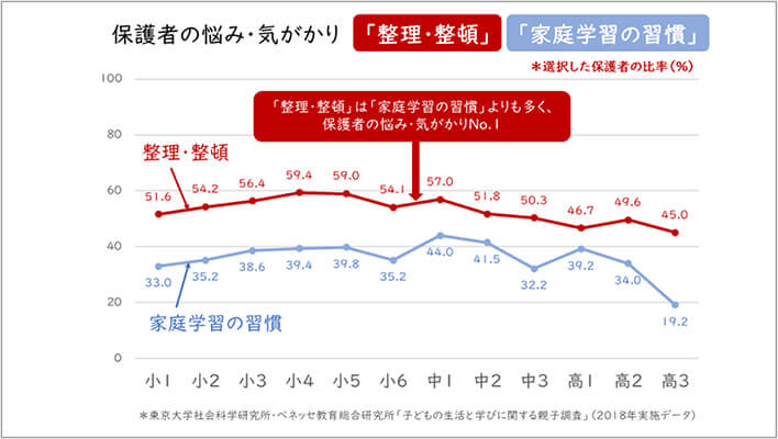 まず、ご紹介したいデータがあります。2018年に行ったアンケートの結果です。保護者のかたに子育ての悩み・気がかりについて聞いたところ、ほぼすべての学年で「整理・整頓」がナンバーワンになりました。それ以外の生活習慣や学習や進路については学年によって差があるものの、「整理・整頓」はどの学年でも数値が高く、半数以上の保護者のかたが悩んでいます。