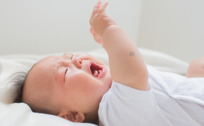 授乳の間隔があき、夜まとまって寝てくれるようになった生後5~6カ月ごろになってから、急に夜中に泣き出す現象が見られたら、それが夜泣きです。