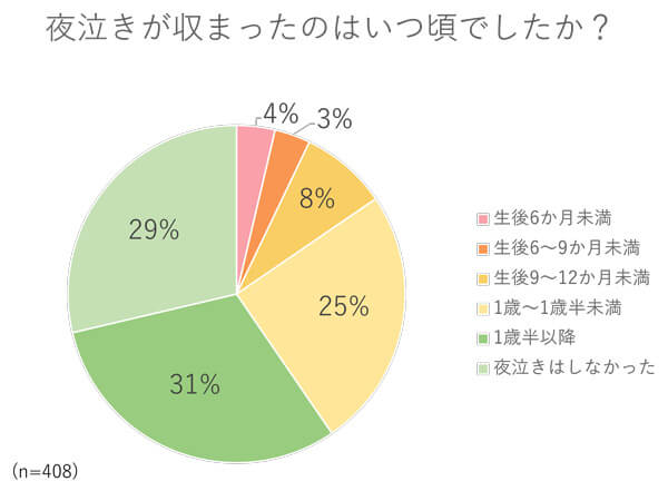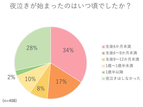 保護者のかた408名に回答いただいたアンケートでも、「生後6か月から夜泣きが始まった」という回答が最も多い結果になりました。