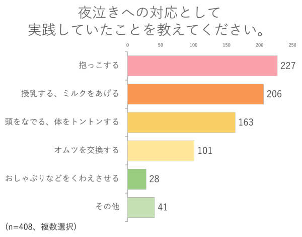 先輩保護者に、夜泣きへの対応として実践していたことを聞いたところ、上記の結果になりました。