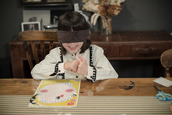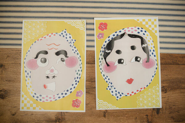 続いて紹介するのは「福笑い」。目隠しをして目や鼻を並べ、できあがった顔を笑ったり、より正確に並べることを競ったりする昔ながらのお正月遊びです。明治時代ごろから広まった遊びと言われています。