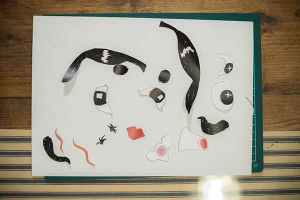 テンプレートを出力したら、顔のパーツごとにハサミでカットしていきます。ハサミを使う細かい作業なので、集中力や巧緻性が養えます。細かい箇所も多いので、ハサミの扱いは、けがのないよう十分注意を。