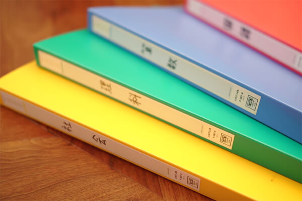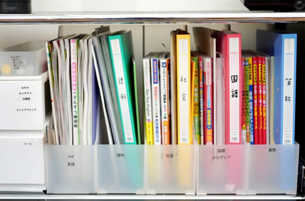 毎日持ち帰る教科書は出し入れが頻繁なため、すぐにぐちゃぐちゃになる傾向があります。そこでおすすめなのが、教科ごとに定位置を決める方法。教科書、ノート、参考書を教科ごとに分けて、ファイルボックスに入れてみましょう。