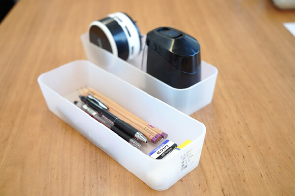教科書やノートと同じように、勉強道具も定位置を決めましょう。小物入れなどのボックスを用意し、筆記用具、鉛筆削り、デスクトップ掃除機などをグルーピングして収納します。こうすれば、取り出すのも収納するのも簡単です。ボックスごと動かせるため、テーブルの上を片付けるときも時短になります。勉強スペースもしっかり確保できるでしょう。