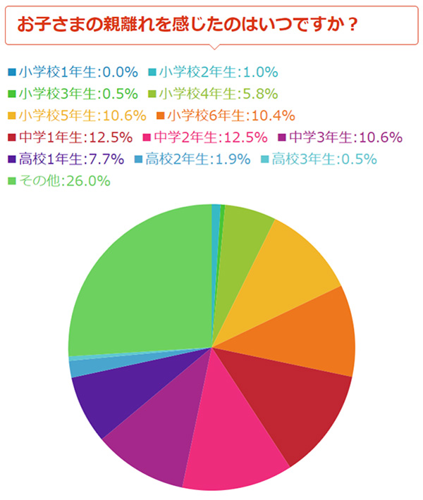 「小学校5年生」(10.6%)、「小学校6年生」(10.4%)、「中学校1年生」(12.5%)、「中学校2年生」(12.5%)、「中学校3年生」(10.6%)と、お子さまが小学生高学年から中学生の間に親離れを感じたという家庭が多いということが分かりました。