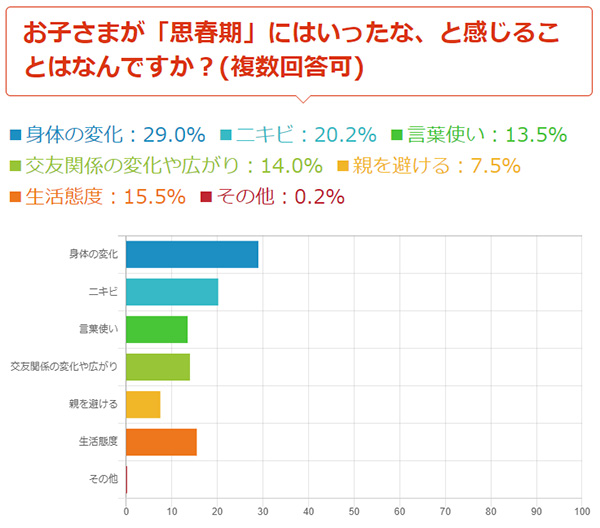 保護者の方が思春期になったと感じたことは、多い順に「身体の変化」(29.0%)、「ニキビ」(20.2%)、「言葉使い」(13.5%)、「交友関係の変化や広がり」(14.0%)、「親を避ける」(7.5%)「生活態度」(15.5%)、という結果になりました。
