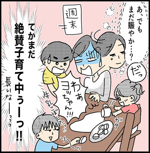 4人の子どもを子育て中のMOTOKOさん家の日常を描いた4コマ漫画。