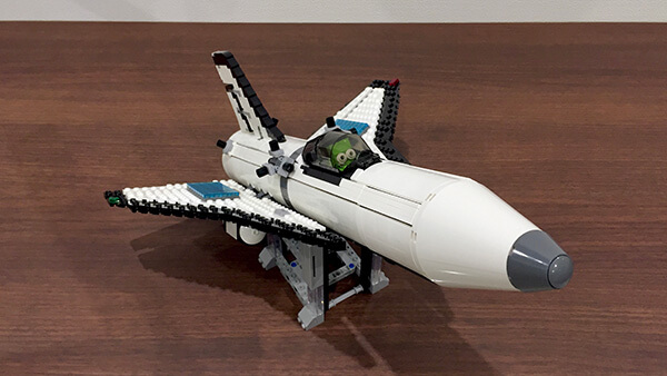 「宇宙開発のレゴ®」と呼ばれる某シミュレーションゲームにはまって、その中で作った小型シャトルを再現しました。大きなロケットの先端に乗せて打ち上げる一人乗りの宇宙船です。見た目優先で作ったためあまり役に立ちませんが、宇宙ステーションにドッキングさせておくと救命艇として使うことができます。