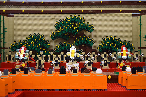 2万個を超えるパーツを使った作品。舞台上の役者や奏者はモーターで動きます。背景の松はあえて立体的にすることでレゴ®らしさを表現しています。