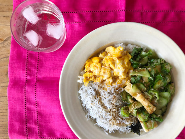 この日は、ごはんに海苔をのせ、シラス、炒り卵、きゅうりとオクラと青シソと焼いたお揚げのナムル。仕上げに、お醤油とごま油を合わせたタレをかけました。