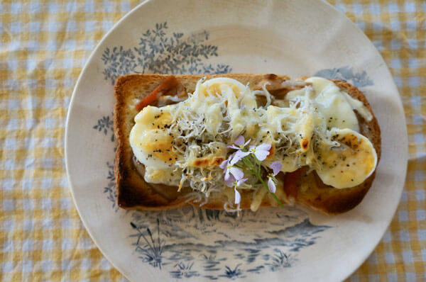 こちらは、食パンにマヨネーズ、きんぴら、ゆで卵、シラス、溶けるチーズをのせて、オーブントースターで焼いたもの。上に、エディブルフラワーをのせて華やかに。
