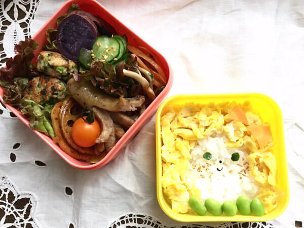 たとえばこんなふうに、デコレーションしたお弁当は、子どものテンションが上がります。ごはんに炒り卵で髪の毛と、枝豆のお洋服をあしらって。キュウリで目、口は海苔、白ごまのそばかすを散らして。おかずは、ほうれん草入りハンバーグ、れんこんきんぴら、タコさんウインナー、塩もみキュウリ、紫芋、ミニトマト。