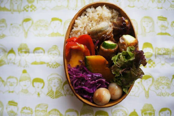 また、好きなおかずで埋め尽くすのも、子どものリクエストに応えるお弁当ならでは。こちらは、ズッキーニも肉巻きとうずらの卵の照り焼き、かぼちゃのソテー、パプリカのチーズ焼き、紫キャベツのマリネ。