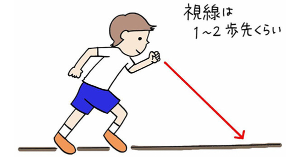 ちょうど良い前傾姿勢をとるためには「目線」も重要なポイントです。遠くを見すぎると、体が直立に近づき、地面を見すぎると前傾ではなく前屈になってしまいます。一足、二足分先を見るように意識して、ちょうど良い前傾姿勢をとれるようにしましょう。