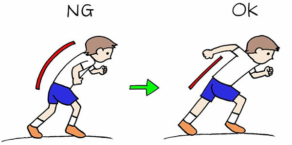 子どもの中には、前傾姿勢でなく直立や後傾でお尻のほうに力が入ってしまう子もいます。その場合、スタート合図が鳴ったあとに体を前に持っていくための時間と無駄な動きが発生してしまうため、要注意です。また、手と足が一緒になってしまうと走りづらくなってしまうため、構えのときから意識しておきましょう。